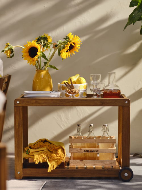 Le jardin est en fleurs. Il est temps maintenant d'ajouter plus de charme grâce à la décoration d'extérieur. Les couleurs et les motifs joyeux de la collection BRÖGGAN créent directement une ambiance estivale. Les produits se mêlent parfaitement à chaque intérieur, ils sont pratiques et faciles d’entretien. Qu'il s'agisse d'une table romantique pour deux sur un balcon, d'un pique-nique en famille dans un parc ou d'une fête dans le jardin, la collection égayera toutes les occasions et vous aidera à créer une belle table à un prix abordable ! Vous manquez de place sur la table ? Le chariot pratique en bois d'acacia peut servir d’extension pour placer des boissons et des serviettes supplémentaires.